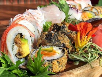Langostinos crispy, queso crema, aguacate, Kanikama. Tope de anguila aderezado con mayo spicy y salsa de anguila.