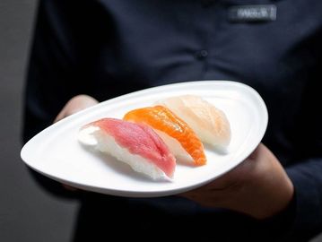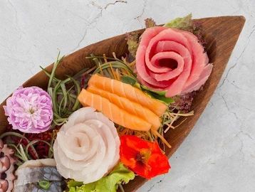 Dos tipos sashimi (5 piezas de c/u), dos tipos de nigiri (2 piezas de c/u), un rollo tradicional, un rollo especial o rollo clásico Canoa.