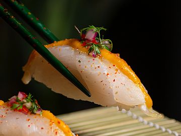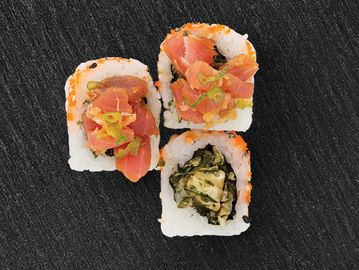 Atún macerado en salsa ligeramente picante, aguacate, cebollín y masago. 10 unds.