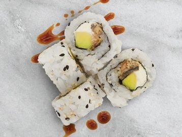 Anguila, queso crema, aguacate, ajonjolí y salsa de anguila. 10 unds.