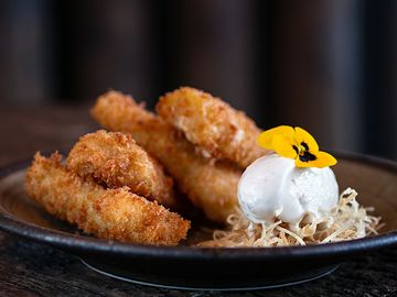 Croquetas de kanikama (palmito de cangrejo) y zanahoria apanadas en panko. Acompañadas de salsa tártara de la casa. 5 unds.