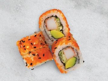 Kanikama tempura, queso crema y aguacate. Tope de gratinado de camarón y masago. 10 unds.