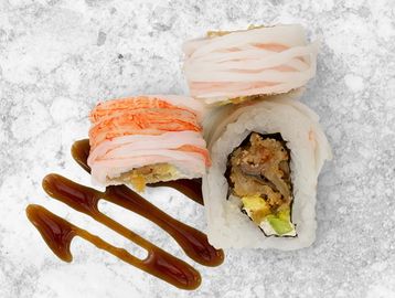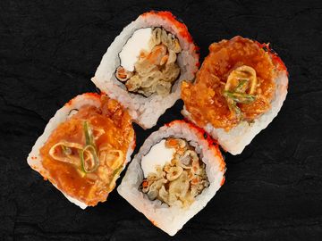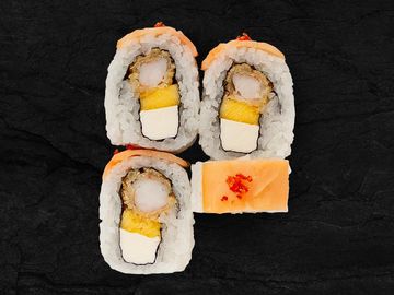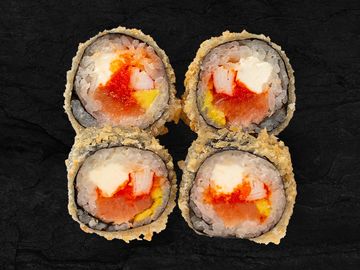 Tempura relleno de kanikama, salmón, aguacate, masago, queso crema y salsa de anguila. 10 unds.