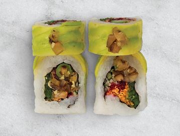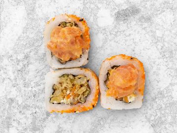 Vegetales tempura, queso crema, tope de masago y camarones crispy, bañados en salsa de miso spicy, furikake y ajonjolí. 10 unds.