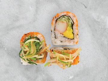 Corvina, salmón, atún frescos y queso crema. Tope de kanikama, wak6ame, cebollín y masago. 10 unds.
