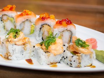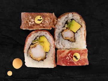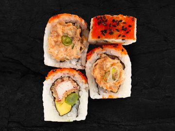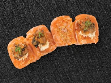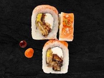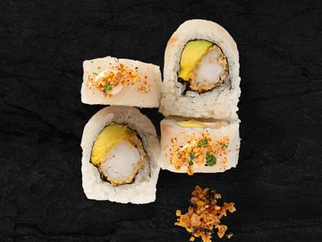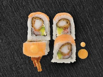 Langostinos tempura, queso crema, aguacate, kanikama. Tope de salmón ahumado, mayo spicy y salsa de anguila. 10 unds.