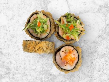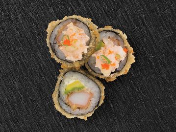 Corvina, salmón y atún frescos con queso crema, tempurizado en panko, tope de wakame, kanikama, cebollín y masago. 10 unds.