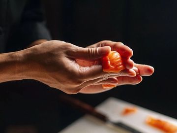 Arroz sazonado con tanuki, Kimchee y masago. Tope de salmón y gratinado de anguila. 10 unds.