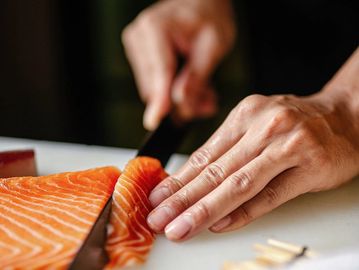 Salmón aderezado con salsa ponzu, mayonesa japonesa, cebollín, masago y aguacate. Servido en canasta de papel de arroz.