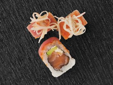 Salmón fresco, aguacate, queso crema, con tope de salmón, atún y ensalada de kanikama. 10 unds.