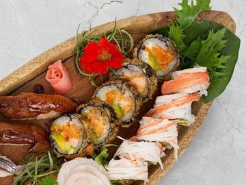 Cinco tipos sashimi (3 piezas de c/u), cuatro tipos de nigiri (2 piezas de c/u), un rollo tradicional, un rollo especial y un rollo clásico Canoa.