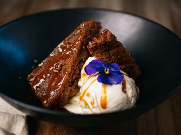 Sticky toffee pudding, con helado de vainilla y toffee.