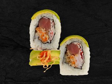 Arroz de sushi, furikake, atún fresco, aguacate, pepino, kanikama, ajonjolí blanco, aderezado con mayo spicy y katsuobushi.