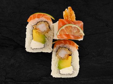 Langostinos tempura, queso crema, aguacate, tope de salmón, láminas de limón y salsa de anguila. 10 unds.
