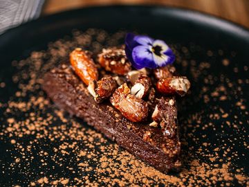 Crema de chocolate y jengibre horneada a baja temperatura terminada con almendras caramelizadas. Libre de gluten y lácteos.